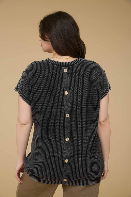 WASHED KNIT SHORT TAB SLEEVE PULLOVER SWEATER
