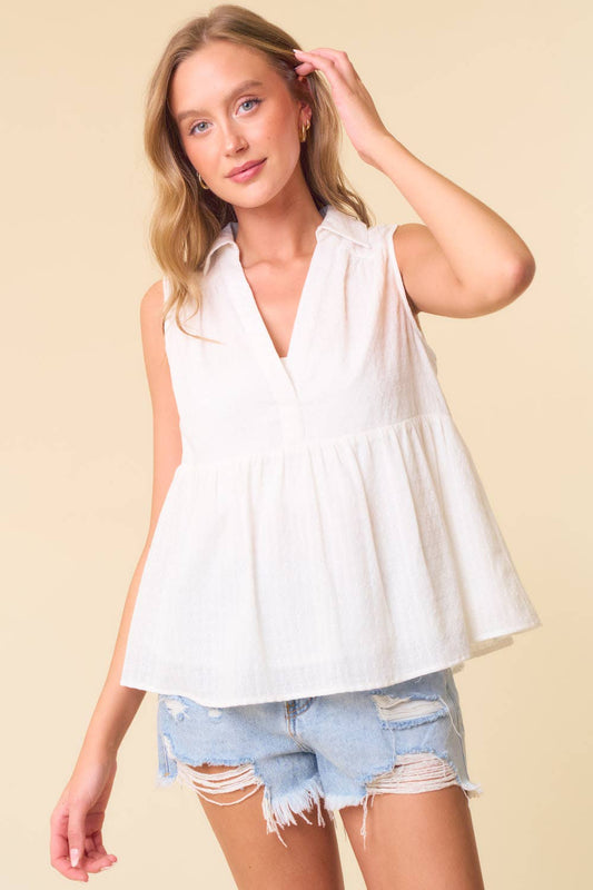 Textured Cotton Collared Split V-Neck Sleeveless