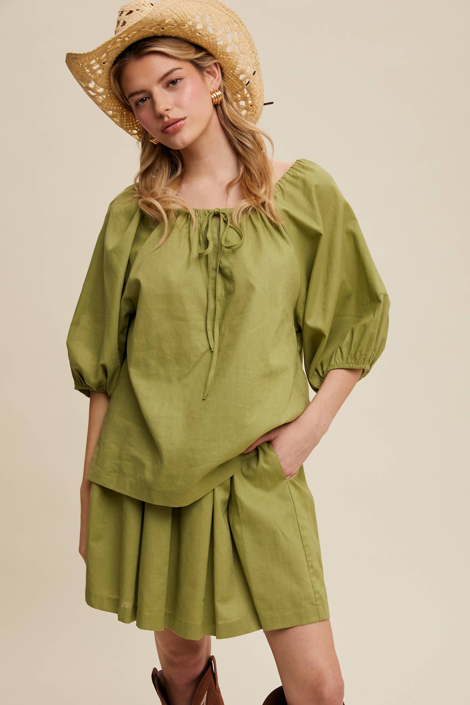 - Breathable Linen Fabric: Crafted from lightweight linen for a soft, airy feel. - Puff Sleeve Blouse: Relaxed fit with gathered sleeves for a romantic, effortless look. - Tie-Neck Detail: Delicate front tie adds a charming, feminine touch. - Elasticized Cuffs: Creates a subtle balloon sleeve effect while ensuring a comfortable fit. - Pleated Skirt: Flowing pleats offer graceful movement and a flattering silhouette. - Functional Side Pockets: Conveniently placed for practicality without sacrificing style. - Fully Lined Skirt: Ensures comfort and opacity for confident wear. - Model is 5' 7.5" 33-24-34 and wearing a size Small Perfect for warm-weather outings, this set exudes effortless elegance-pair with sandals for a casual vibe or elevate with boots and statement accessories.