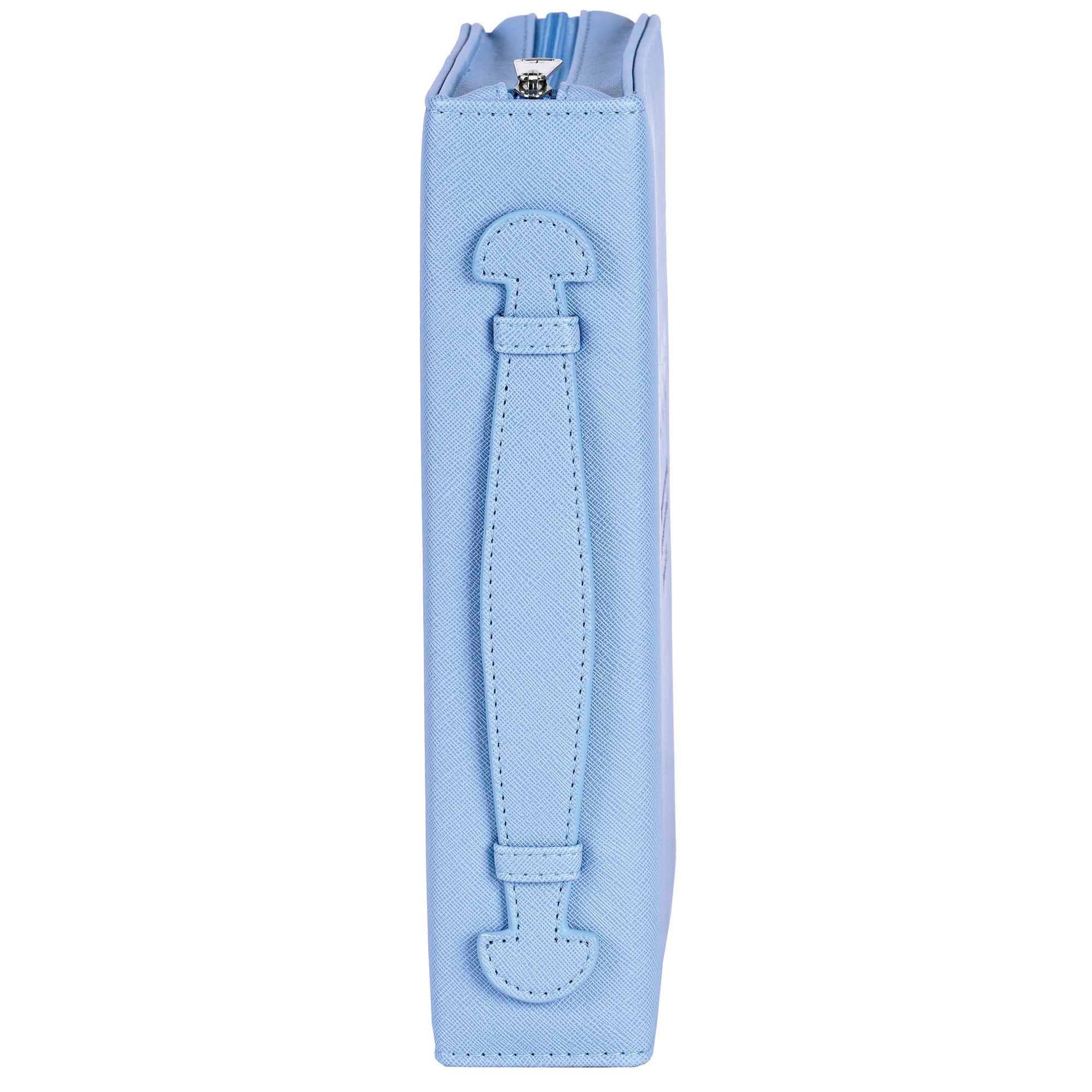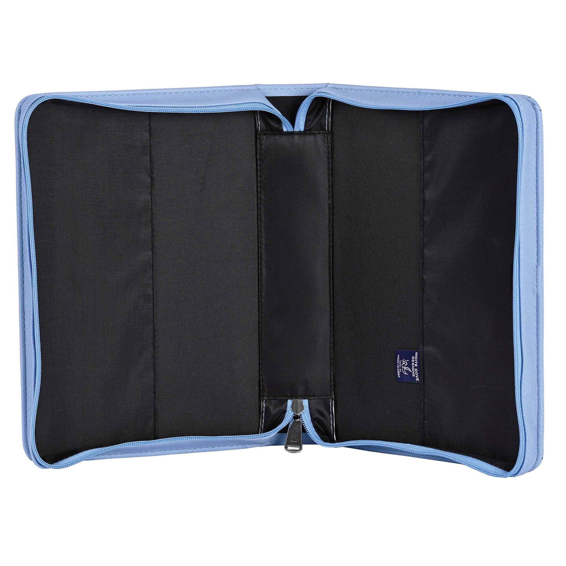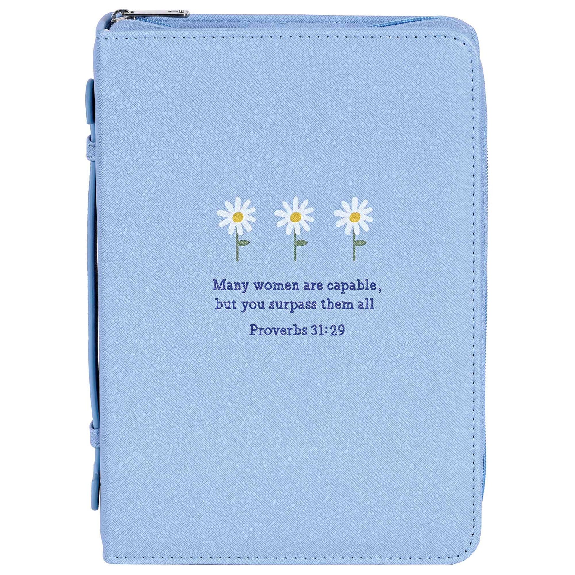 This Periwinkle-Blue Bible Case Is Made From Polyurethane, In Hard-Shell Style. Has Lay-Flat Construction, With A Cross Zipper Pull. The Zipper Is Non-Rusting And Self-Repairing. This Cover Boasts Nylon Reinforced Stitching Plus A Side Carrying Handle. Inside Is An Elastic Pen Loop To Keep Your Pen Secure. The Front Has A Sweet Daisy Design With Proverbs 31:29: Many Women Are Capable, But You Surpass Them All. XLarge Size: 10-1/4 X 2 X 7-1/4. White Dove Design.