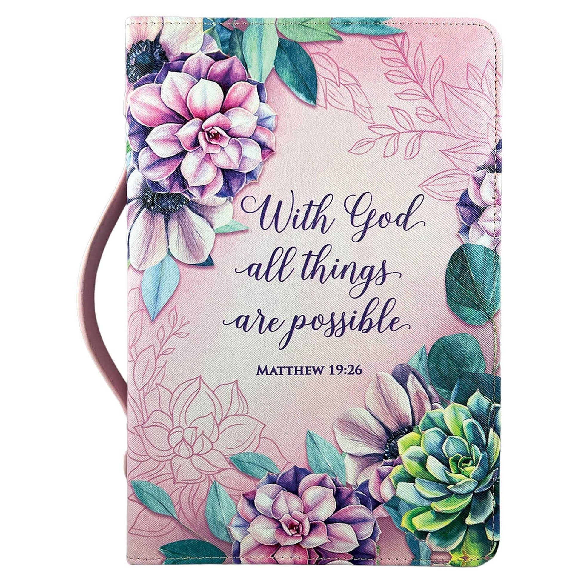 Pink Bible Cover With Beautiful Floral Accents. Features Matthew 19:26: With God All Things Are Possible. Size XL White Dove design