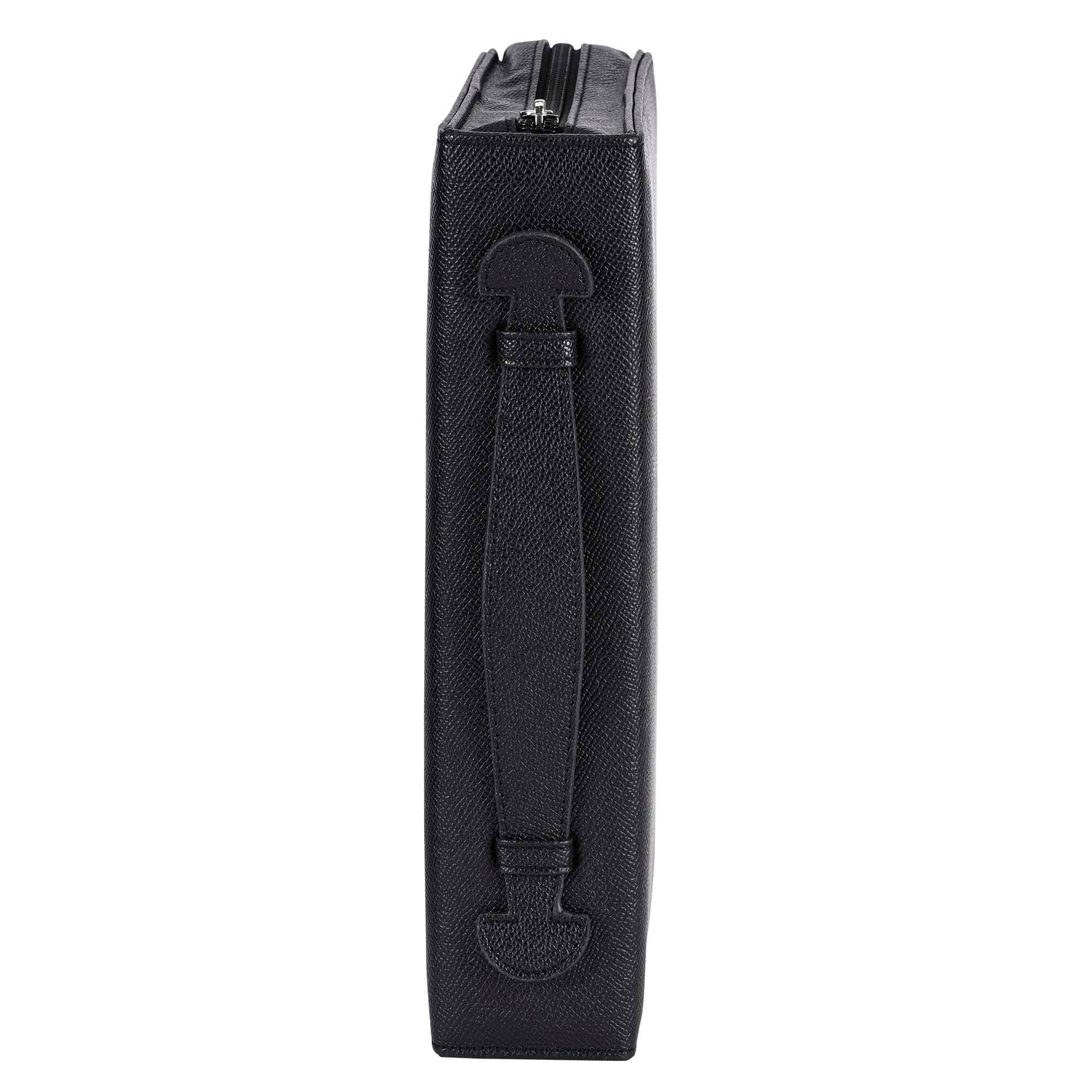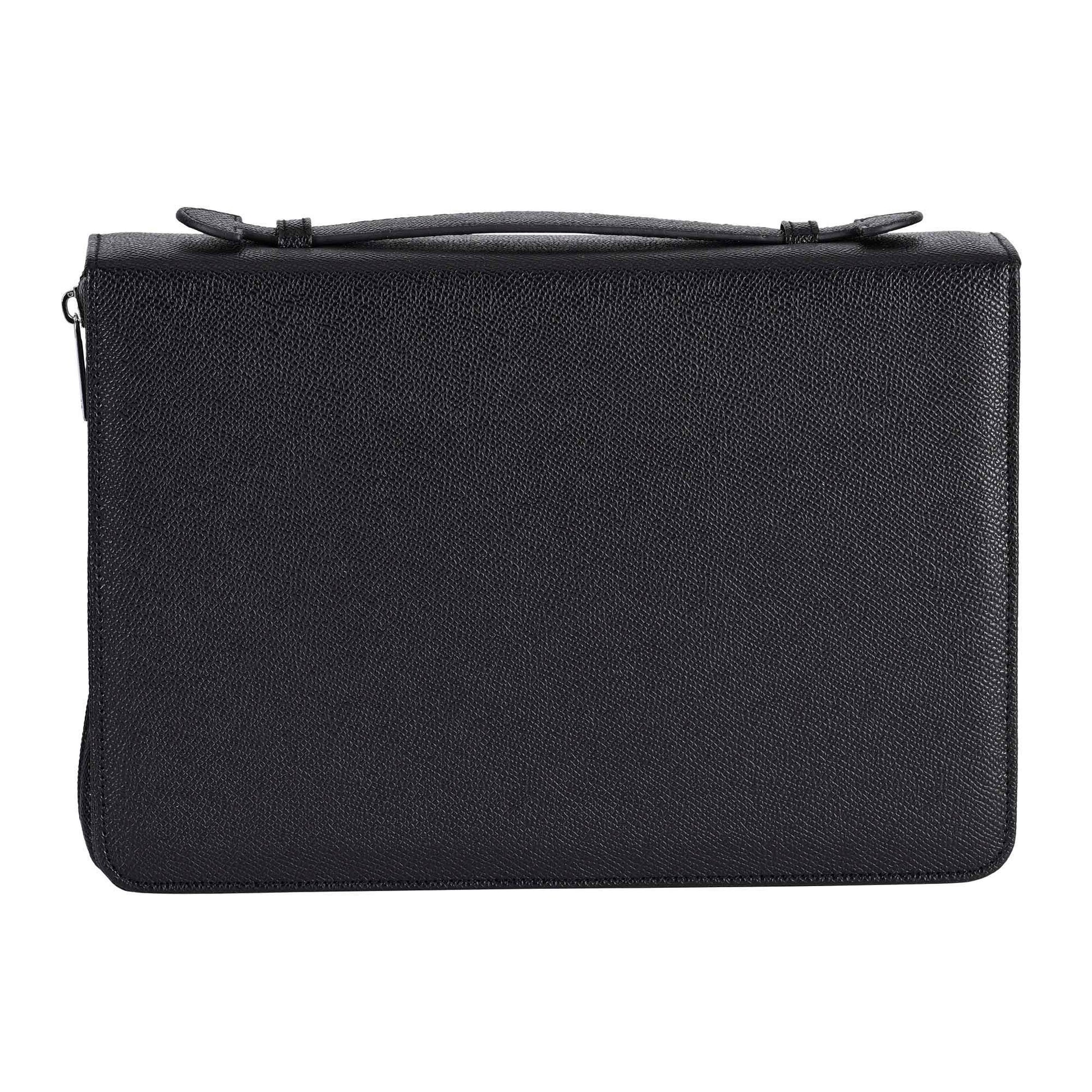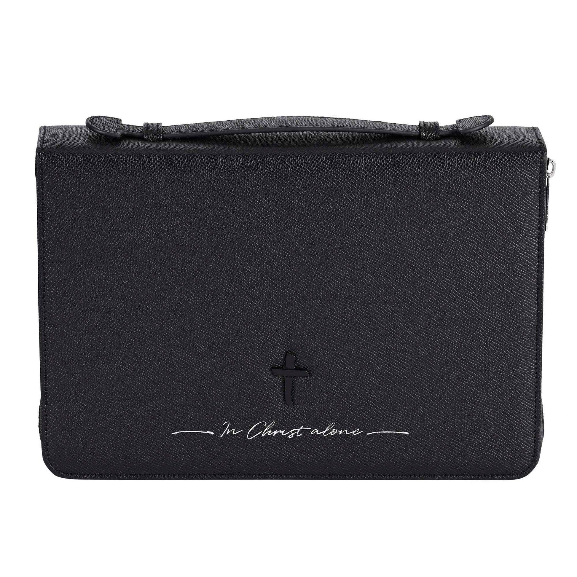 Hard shell style polyurethane Bible cover. Solid color black handbag material with matching color Cross plate and debossed text: In Christ alone.. Inside is a bookmark & elastic pen loop with cut thru Cross zipper pull; side handle, non-rusting self-repairing zipper, nylon reinforced stitching, XX-Large holds a Bible or book up to 10-3/4 x 8-1/4 x 2. White Dove design